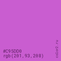 Цвет #C95DD0 в цветовой модели RGB обозначается тремя октетами (201, 93, 208) в десятичном формате и #C95DD0 в шестнадцатиричном (hex) формате, которые являются интенсивностью красного 201 (hex C9), интенсивность зелёного 93 (hex 5D) и интенсивность синего 208 (hex D0).