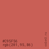 Цвет #C95F56 в цветовой модели RGB обозначается тремя октетами (201, 95, 86) в десятичном формате и #C95F56 в шестнадцатиричном (hex) формате, которые являются интенсивностью красного 201 (hex C9), интенсивность зелёного 95 (hex 5F) и интенсивность синего 86 (hex 56).