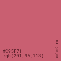 Цвет #C95F71 в цветовой модели RGB обозначается тремя октетами (201, 95, 113) в десятичном формате и #C95F71 в шестнадцатиричном (hex) формате, которые являются интенсивностью красного 201 (hex C9), интенсивность зелёного 95 (hex 5F) и интенсивность синего 113 (hex 71).
