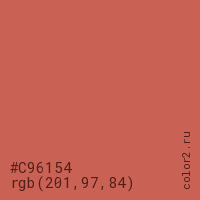 Цвет #C96154 в цветовой модели RGB обозначается тремя октетами (201, 97, 84) в десятичном формате и #C96154 в шестнадцатиричном (hex) формате, которые являются интенсивностью красного 201 (hex C9), интенсивность зелёного 97 (hex 61) и интенсивность синего 84 (hex 54).