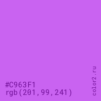 Цвет #C963F1 в цветовой модели RGB обозначается тремя октетами (201, 99, 241) в десятичном формате и #C963F1 в шестнадцатиричном (hex) формате, которые являются интенсивностью красного 201 (hex C9), интенсивность зелёного 99 (hex 63) и интенсивность синего 241 (hex F1).