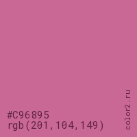 Цвет #C96895 в цветовой модели RGB обозначается тремя октетами (201, 104, 149) в десятичном формате и #C96895 в шестнадцатиричном (hex) формате, которые являются интенсивностью красного 201 (hex C9), интенсивность зелёного 104 (hex 68) и интенсивность синего 149 (hex 95).