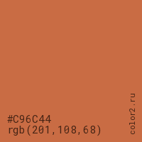 Цвет #C96C44 в цветовой модели RGB обозначается тремя октетами (201, 108, 68) в десятичном формате и #C96C44 в шестнадцатиричном (hex) формате, которые являются интенсивностью красного 201 (hex C9), интенсивность зелёного 108 (hex 6C) и интенсивность синего 68 (hex 44).