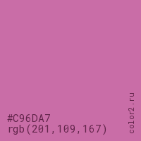 Цвет #C96DA7 в цветовой модели RGB обозначается тремя октетами (201, 109, 167) в десятичном формате и #C96DA7 в шестнадцатиричном (hex) формате, которые являются интенсивностью красного 201 (hex C9), интенсивность зелёного 109 (hex 6D) и интенсивность синего 167 (hex A7).