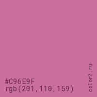 Цвет #C96E9F в цветовой модели RGB обозначается тремя октетами (201, 110, 159) в десятичном формате и #C96E9F в шестнадцатиричном (hex) формате, которые являются интенсивностью красного 201 (hex C9), интенсивность зелёного 110 (hex 6E) и интенсивность синего 159 (hex 9F).