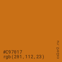 Цвет #C97017 в цветовой модели RGB обозначается тремя октетами (201, 112, 23) в десятичном формате и #C97017 в шестнадцатиричном (hex) формате, которые являются интенсивностью красного 201 (hex C9), интенсивность зелёного 112 (hex 70) и интенсивность синего 23 (hex 17).
