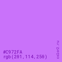 Цвет #C972FA в цветовой модели RGB обозначается тремя октетами (201, 114, 250) в десятичном формате и #C972FA в шестнадцатиричном (hex) формате, которые являются интенсивностью красного 201 (hex C9), интенсивность зелёного 114 (hex 72) и интенсивность синего 250 (hex FA).