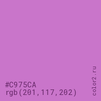 Цвет #C975CA в цветовой модели RGB обозначается тремя октетами (201, 117, 202) в десятичном формате и #C975CA в шестнадцатиричном (hex) формате, которые являются интенсивностью красного 201 (hex C9), интенсивность зелёного 117 (hex 75) и интенсивность синего 202 (hex CA).