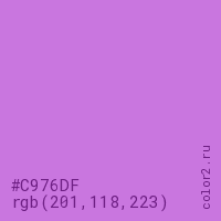 Цвет #C976DF в цветовой модели RGB обозначается тремя октетами (201, 118, 223) в десятичном формате и #C976DF в шестнадцатиричном (hex) формате, которые являются интенсивностью красного 201 (hex C9), интенсивность зелёного 118 (hex 76) и интенсивность синего 223 (hex DF).