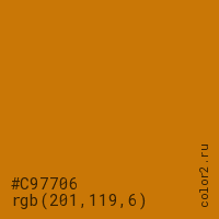 Цвет #C97706 в цветовой модели RGB обозначается тремя октетами (201, 119, 6) в десятичном формате и #C97706 в шестнадцатиричном (hex) формате, которые являются интенсивностью красного 201 (hex C9), интенсивность зелёного 119 (hex 77) и интенсивность синего 6 (hex 06).