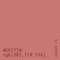 Цвет #C97774 в цветовой модели RGB обозначается тремя октетами (201, 119, 116) в десятичном формате и #C97774 в шестнадцатиричном (hex) формате, которые являются интенсивностью красного 201 (hex C9), интенсивность зелёного 119 (hex 77) и интенсивность синего 116 (hex 74).