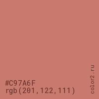 Цвет #C97A6F в цветовой модели RGB обозначается тремя октетами (201, 122, 111) в десятичном формате и #C97A6F в шестнадцатиричном (hex) формате, которые являются интенсивностью красного 201 (hex C9), интенсивность зелёного 122 (hex 7A) и интенсивность синего 111 (hex 6F).