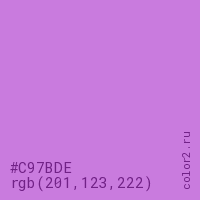 Цвет #C97BDE в цветовой модели RGB обозначается тремя октетами (201, 123, 222) в десятичном формате и #C97BDE в шестнадцатиричном (hex) формате, которые являются интенсивностью красного 201 (hex C9), интенсивность зелёного 123 (hex 7B) и интенсивность синего 222 (hex DE).
