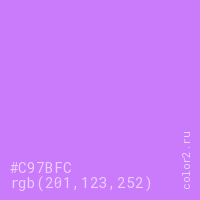 Цвет #C97BFC в цветовой модели RGB обозначается тремя октетами (201, 123, 252) в десятичном формате и #C97BFC в шестнадцатиричном (hex) формате, которые являются интенсивностью красного 201 (hex C9), интенсивность зелёного 123 (hex 7B) и интенсивность синего 252 (hex FC).