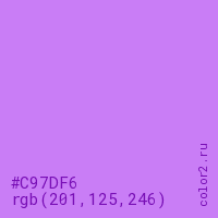 Цвет #C97DF6 в цветовой модели RGB обозначается тремя октетами (201, 125, 246) в десятичном формате и #C97DF6 в шестнадцатиричном (hex) формате, которые являются интенсивностью красного 201 (hex C9), интенсивность зелёного 125 (hex 7D) и интенсивность синего 246 (hex F6).