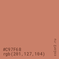 Цвет #C97F68 в цветовой модели RGB обозначается тремя октетами (201, 127, 104) в десятичном формате и #C97F68 в шестнадцатиричном (hex) формате, которые являются интенсивностью красного 201 (hex C9), интенсивность зелёного 127 (hex 7F) и интенсивность синего 104 (hex 68).