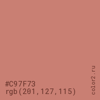 Цвет #C97F73 в цветовой модели RGB обозначается тремя октетами (201, 127, 115) в десятичном формате и #C97F73 в шестнадцатиричном (hex) формате, которые являются интенсивностью красного 201 (hex C9), интенсивность зелёного 127 (hex 7F) и интенсивность синего 115 (hex 73).
