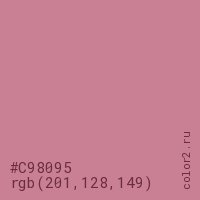 Цвет #C98095 в цветовой модели RGB обозначается тремя октетами (201, 128, 149) в десятичном формате и #C98095 в шестнадцатиричном (hex) формате, которые являются интенсивностью красного 201 (hex C9), интенсивность зелёного 128 (hex 80) и интенсивность синего 149 (hex 95).