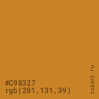 Цвет #C98327 в цветовой модели RGB обозначается тремя октетами (201, 131, 39) в десятичном формате и #C98327 в шестнадцатиричном (hex) формате, которые являются интенсивностью красного 201 (hex C9), интенсивность зелёного 131 (hex 83) и интенсивность синего 39 (hex 27).