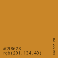 Цвет #C98628 в цветовой модели RGB обозначается тремя октетами (201, 134, 40) в десятичном формате и #C98628 в шестнадцатиричном (hex) формате, которые являются интенсивностью красного 201 (hex C9), интенсивность зелёного 134 (hex 86) и интенсивность синего 40 (hex 28).