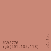 Цвет #C98776 в цветовой модели RGB обозначается тремя октетами (201, 135, 118) в десятичном формате и #C98776 в шестнадцатиричном (hex) формате, которые являются интенсивностью красного 201 (hex C9), интенсивность зелёного 135 (hex 87) и интенсивность синего 118 (hex 76).
