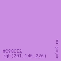 Цвет #C98CE2 в цветовой модели RGB обозначается тремя октетами (201, 140, 226) в десятичном формате и #C98CE2 в шестнадцатиричном (hex) формате, которые являются интенсивностью красного 201 (hex C9), интенсивность зелёного 140 (hex 8C) и интенсивность синего 226 (hex E2).