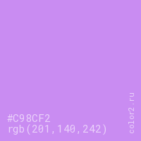 Цвет #C98CF2 в цветовой модели RGB обозначается тремя октетами (201, 140, 242) в десятичном формате и #C98CF2 в шестнадцатиричном (hex) формате, которые являются интенсивностью красного 201 (hex C9), интенсивность зелёного 140 (hex 8C) и интенсивность синего 242 (hex F2).