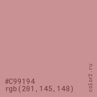 Цвет #C99194 в цветовой модели RGB обозначается тремя октетами (201, 145, 148) в десятичном формате и #C99194 в шестнадцатиричном (hex) формате, которые являются интенсивностью красного 201 (hex C9), интенсивность зелёного 145 (hex 91) и интенсивность синего 148 (hex 94).