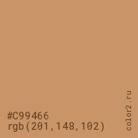 Цвет #C99466 в цветовой модели RGB обозначается тремя октетами (201, 148, 102) в десятичном формате и #C99466 в шестнадцатиричном (hex) формате, которые являются интенсивностью красного 201 (hex C9), интенсивность зелёного 148 (hex 94) и интенсивность синего 102 (hex 66).