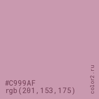 Цвет #C999AF в цветовой модели RGB обозначается тремя октетами (201, 153, 175) в десятичном формате и #C999AF в шестнадцатиричном (hex) формате, которые являются интенсивностью красного 201 (hex C9), интенсивность зелёного 153 (hex 99) и интенсивность синего 175 (hex AF).