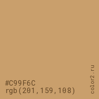 Цвет #C99F6C в цветовой модели RGB обозначается тремя октетами (201, 159, 108) в десятичном формате и #C99F6C в шестнадцатиричном (hex) формате, которые являются интенсивностью красного 201 (hex C9), интенсивность зелёного 159 (hex 9F) и интенсивность синего 108 (hex 6C).