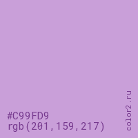 Цвет #C99FD9 в цветовой модели RGB обозначается тремя октетами (201, 159, 217) в десятичном формате и #C99FD9 в шестнадцатиричном (hex) формате, которые являются интенсивностью красного 201 (hex C9), интенсивность зелёного 159 (hex 9F) и интенсивность синего 217 (hex D9).