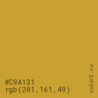 Цвет #C9A131 в цветовой модели RGB обозначается тремя октетами (201, 161, 49) в десятичном формате и #C9A131 в шестнадцатиричном (hex) формате, которые являются интенсивностью красного 201 (hex C9), интенсивность зелёного 161 (hex A1) и интенсивность синего 49 (hex 31).