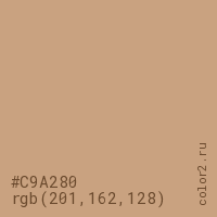 Цвет #C9A280 в цветовой модели RGB обозначается тремя октетами (201, 162, 128) в десятичном формате и #C9A280 в шестнадцатиричном (hex) формате, которые являются интенсивностью красного 201 (hex C9), интенсивность зелёного 162 (hex A2) и интенсивность синего 128 (hex 80).