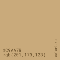 Цвет #C9AA7B в цветовой модели RGB обозначается тремя октетами (201, 170, 123) в десятичном формате и #C9AA7B в шестнадцатиричном (hex) формате, которые являются интенсивностью красного 201 (hex C9), интенсивность зелёного 170 (hex AA) и интенсивность синего 123 (hex 7B).