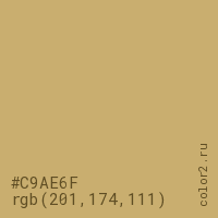 Цвет #C9AE6F в цветовой модели RGB обозначается тремя октетами (201, 174, 111) в десятичном формате и #C9AE6F в шестнадцатиричном (hex) формате, которые являются интенсивностью красного 201 (hex C9), интенсивность зелёного 174 (hex AE) и интенсивность синего 111 (hex 6F).