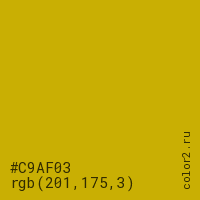 Цвет #C9AF03 в цветовой модели RGB обозначается тремя октетами (201, 175, 3) в десятичном формате и #C9AF03 в шестнадцатиричном (hex) формате, которые являются интенсивностью красного 201 (hex C9), интенсивность зелёного 175 (hex AF) и интенсивность синего 3 (hex 03).