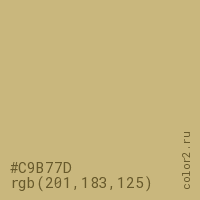 Цвет #C9B77D в цветовой модели RGB обозначается тремя октетами (201, 183, 125) в десятичном формате и #C9B77D в шестнадцатиричном (hex) формате, которые являются интенсивностью красного 201 (hex C9), интенсивность зелёного 183 (hex B7) и интенсивность синего 125 (hex 7D).
