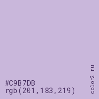 Цвет #C9B7DB в цветовой модели RGB обозначается тремя октетами (201, 183, 219) в десятичном формате и #C9B7DB в шестнадцатиричном (hex) формате, которые являются интенсивностью красного 201 (hex C9), интенсивность зелёного 183 (hex B7) и интенсивность синего 219 (hex DB).