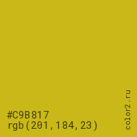 Цвет #C9B817 в цветовой модели RGB обозначается тремя октетами (201, 184, 23) в десятичном формате и #C9B817 в шестнадцатиричном (hex) формате, которые являются интенсивностью красного 201 (hex C9), интенсивность зелёного 184 (hex B8) и интенсивность синего 23 (hex 17).