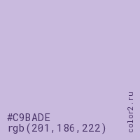 Цвет #C9BADE в цветовой модели RGB обозначается тремя октетами (201, 186, 222) в десятичном формате и #C9BADE в шестнадцатиричном (hex) формате, которые являются интенсивностью красного 201 (hex C9), интенсивность зелёного 186 (hex BA) и интенсивность синего 222 (hex DE).