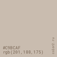 Цвет #C9BCAF в цветовой модели RGB обозначается тремя октетами (201, 188, 175) в десятичном формате и #C9BCAF в шестнадцатиричном (hex) формате, которые являются интенсивностью красного 201 (hex C9), интенсивность зелёного 188 (hex BC) и интенсивность синего 175 (hex AF).