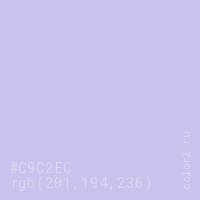Цвет #C9C2EC в цветовой модели RGB обозначается тремя октетами (201, 194, 236) в десятичном формате и #C9C2EC в шестнадцатиричном (hex) формате, которые являются интенсивностью красного 201 (hex C9), интенсивность зелёного 194 (hex C2) и интенсивность синего 236 (hex EC).