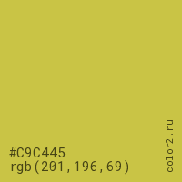 Цвет #C9C445 в цветовой модели RGB обозначается тремя октетами (201, 196, 69) в десятичном формате и #C9C445 в шестнадцатиричном (hex) формате, которые являются интенсивностью красного 201 (hex C9), интенсивность зелёного 196 (hex C4) и интенсивность синего 69 (hex 45).