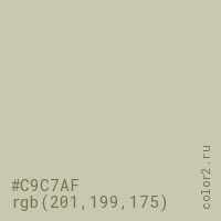 Цвет #C9C7AF в цветовой модели RGB обозначается тремя октетами (201, 199, 175) в десятичном формате и #C9C7AF в шестнадцатиричном (hex) формате, которые являются интенсивностью красного 201 (hex C9), интенсивность зелёного 199 (hex C7) и интенсивность синего 175 (hex AF).