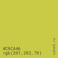 Цвет #C9CA46 в цветовой модели RGB обозначается тремя октетами (201, 202, 70) в десятичном формате и #C9CA46 в шестнадцатиричном (hex) формате, которые являются интенсивностью красного 201 (hex C9), интенсивность зелёного 202 (hex CA) и интенсивность синего 70 (hex 46).
