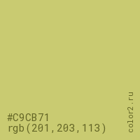 Цвет #C9CB71 в цветовой модели RGB обозначается тремя октетами (201, 203, 113) в десятичном формате и #C9CB71 в шестнадцатиричном (hex) формате, которые являются интенсивностью красного 201 (hex C9), интенсивность зелёного 203 (hex CB) и интенсивность синего 113 (hex 71).
