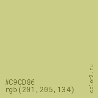 Цвет #C9CD86 в цветовой модели RGB обозначается тремя октетами (201, 205, 134) в десятичном формате и #C9CD86 в шестнадцатиричном (hex) формате, которые являются интенсивностью красного 201 (hex C9), интенсивность зелёного 205 (hex CD) и интенсивность синего 134 (hex 86).