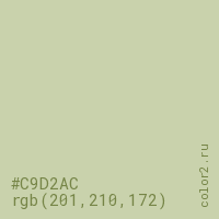 Цвет #C9D2AC в цветовой модели RGB обозначается тремя октетами (201, 210, 172) в десятичном формате и #C9D2AC в шестнадцатиричном (hex) формате, которые являются интенсивностью красного 201 (hex C9), интенсивность зелёного 210 (hex D2) и интенсивность синего 172 (hex AC).