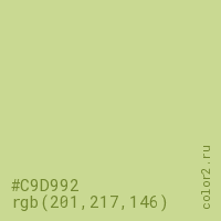 Цвет #C9D992 в цветовой модели RGB обозначается тремя октетами (201, 217, 146) в десятичном формате и #C9D992 в шестнадцатиричном (hex) формате, которые являются интенсивностью красного 201 (hex C9), интенсивность зелёного 217 (hex D9) и интенсивность синего 146 (hex 92).